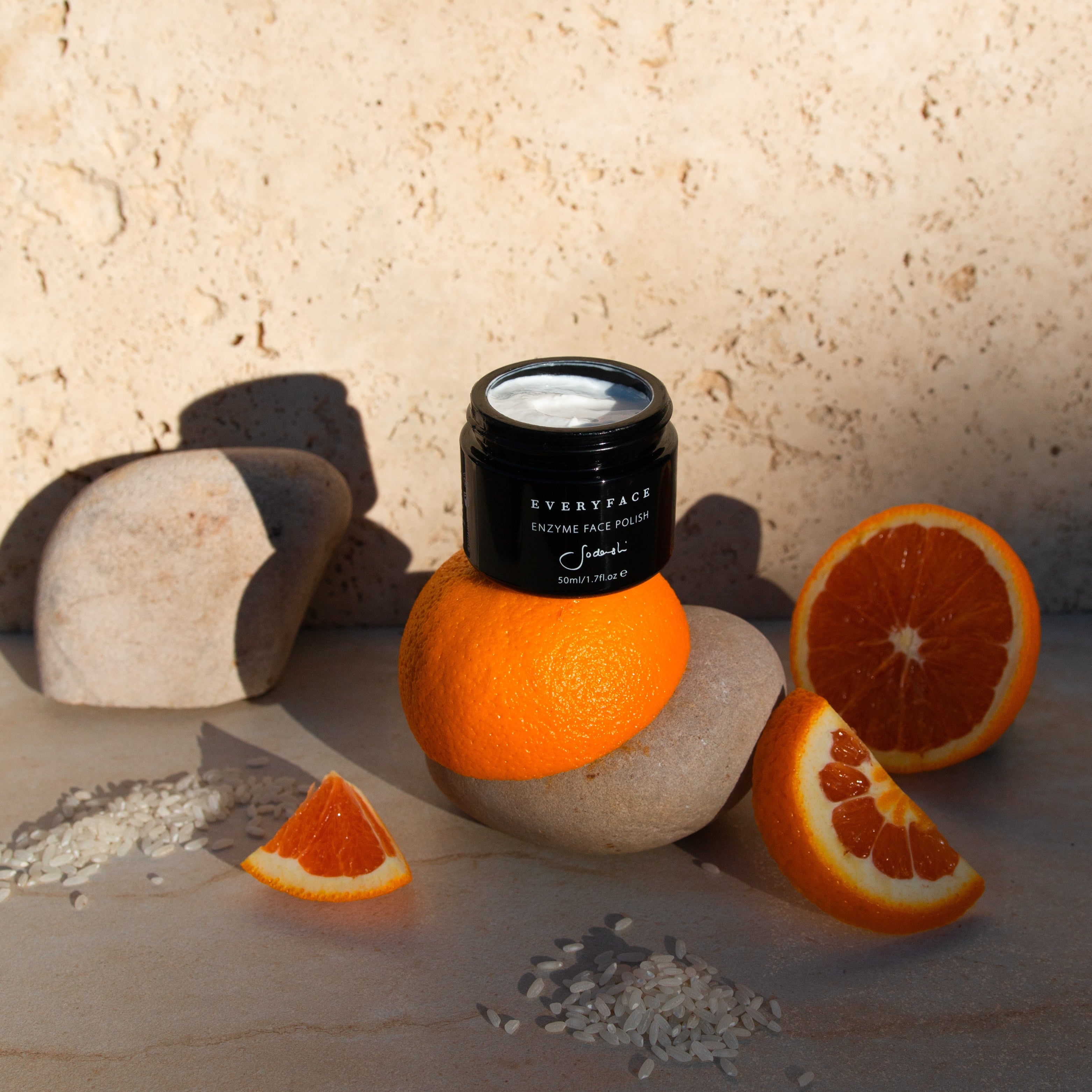 A blend of finely ground rice powder and pomegranate enzymes work to exfoliate and soften the skin, while natural brightening agents Geranium and Sweet Orange deliver serious skin perfecting benefits.