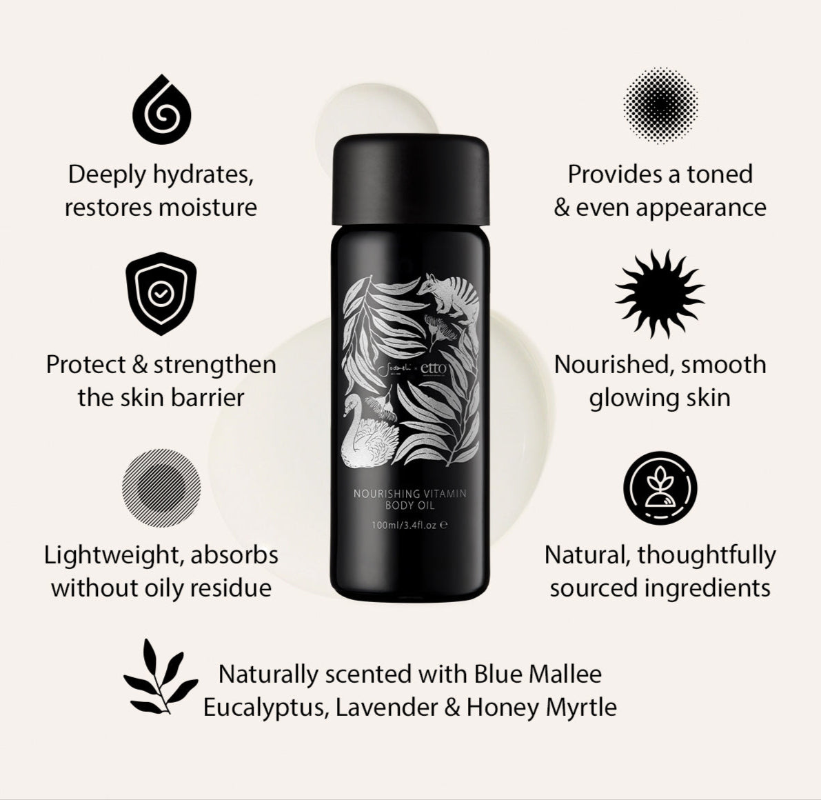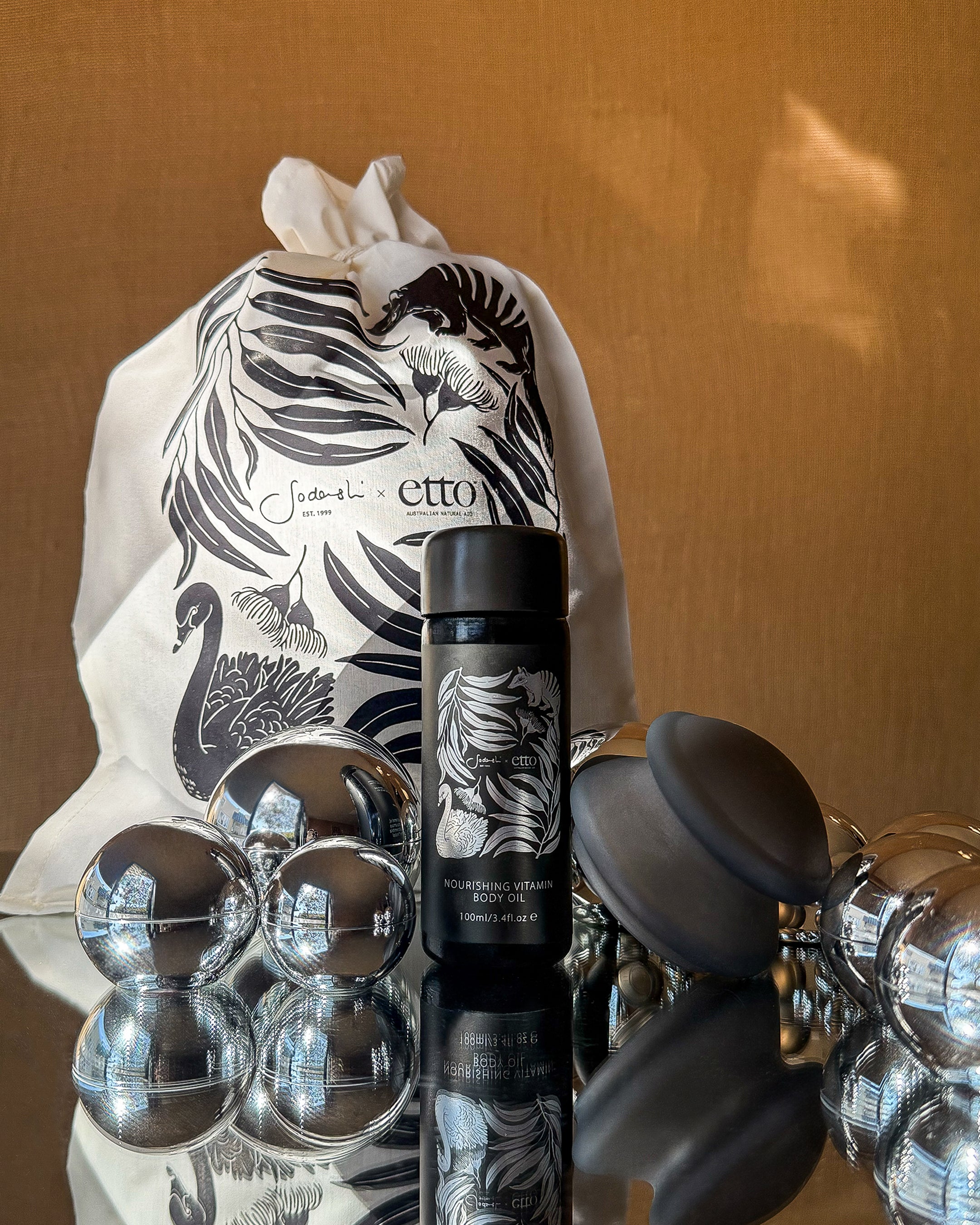 - Sodashi x ETTO Nourishing Vitamin Body Oil (100ml) infused with Blue Mallee Eucalyptus, vitamins, and restorative botanicals.