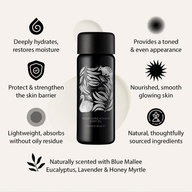 The Nourishing Vitamin Body Oil is infused with the green, spicy freshness of Blue Mallee Eucalyptus, Lavender and Honey Myrtle. Silky and hydrating, it absorbs beautifully into damp skin, leaving it smooth, supple and luminous. Enhanced with vitamins and restorative botanicals, it delivers a moment of connection, beauty and wellbeing - an indulgence to gift or to keep for yourself.